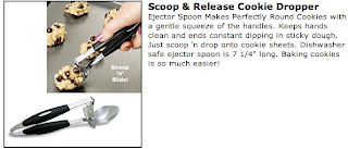 Although my sister-in-law’s birthday is over one month away I saw this scoop-and-release cookie dropper and just had to buy one for her. She currently uses a ice cream scooper but this technique seems much more like the old two-spoon scrapping routine I used as a kid.